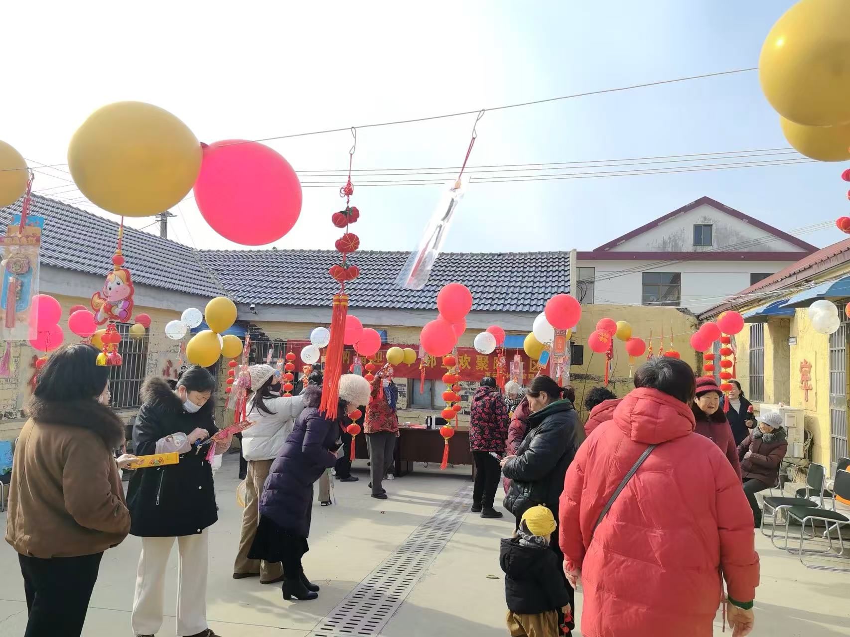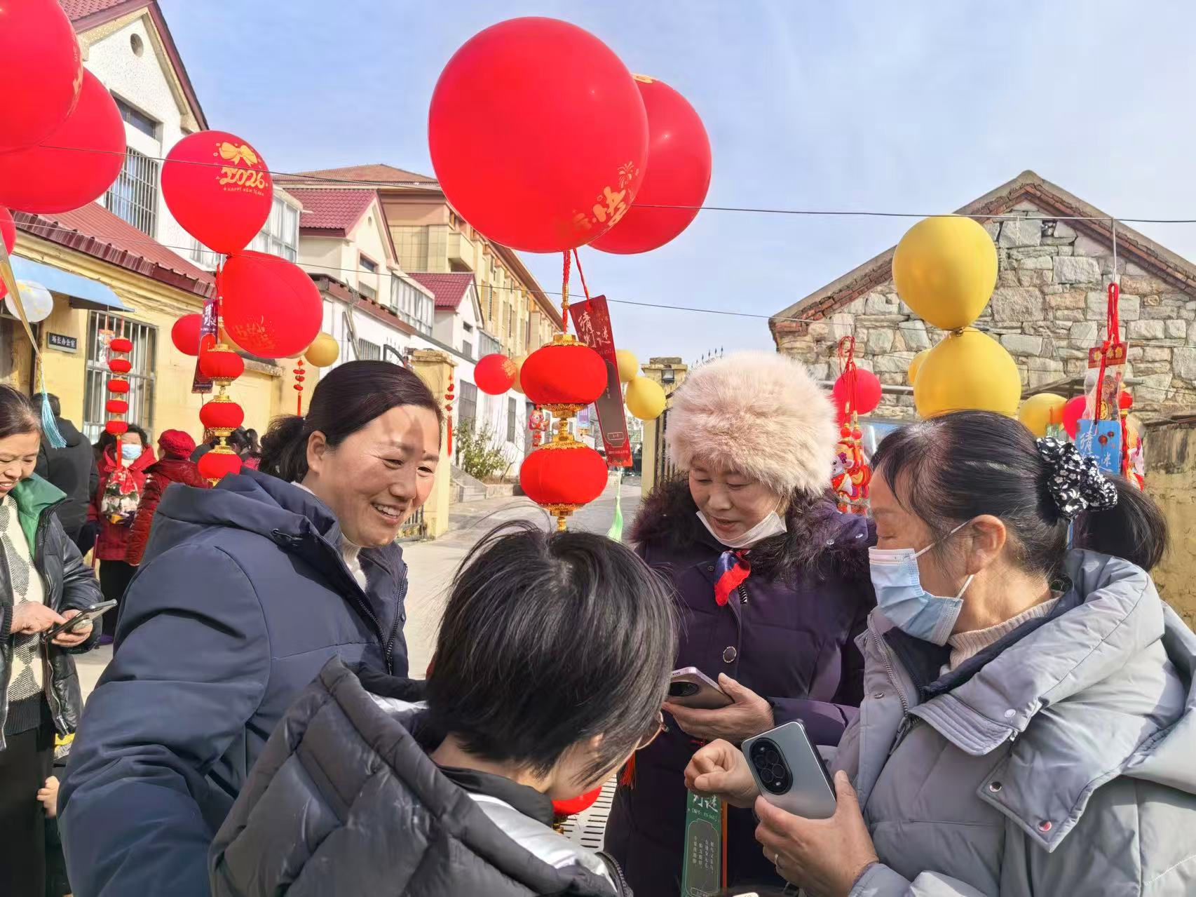 活动现场洋溢着热闹喜庆的节日氛围。猜灯谜区内,一盏盏红灯笼高高悬挂,垂挂着的谜条上写满了民俗知识和马年寄语,吸引着居民驻足停留。大家围聚在一起,或凝神思考、或互相讨论,不时迸发出欢快的笑声,场面温馨而热闹。
