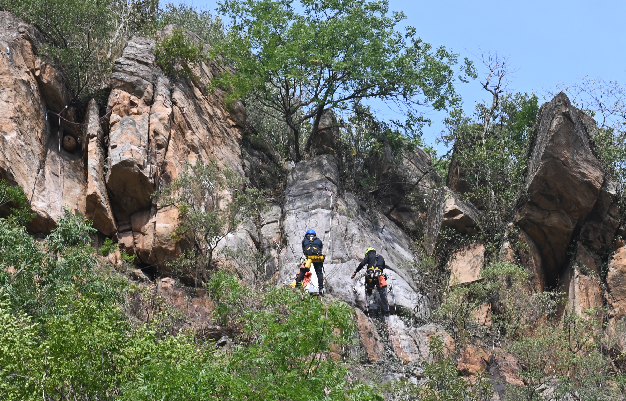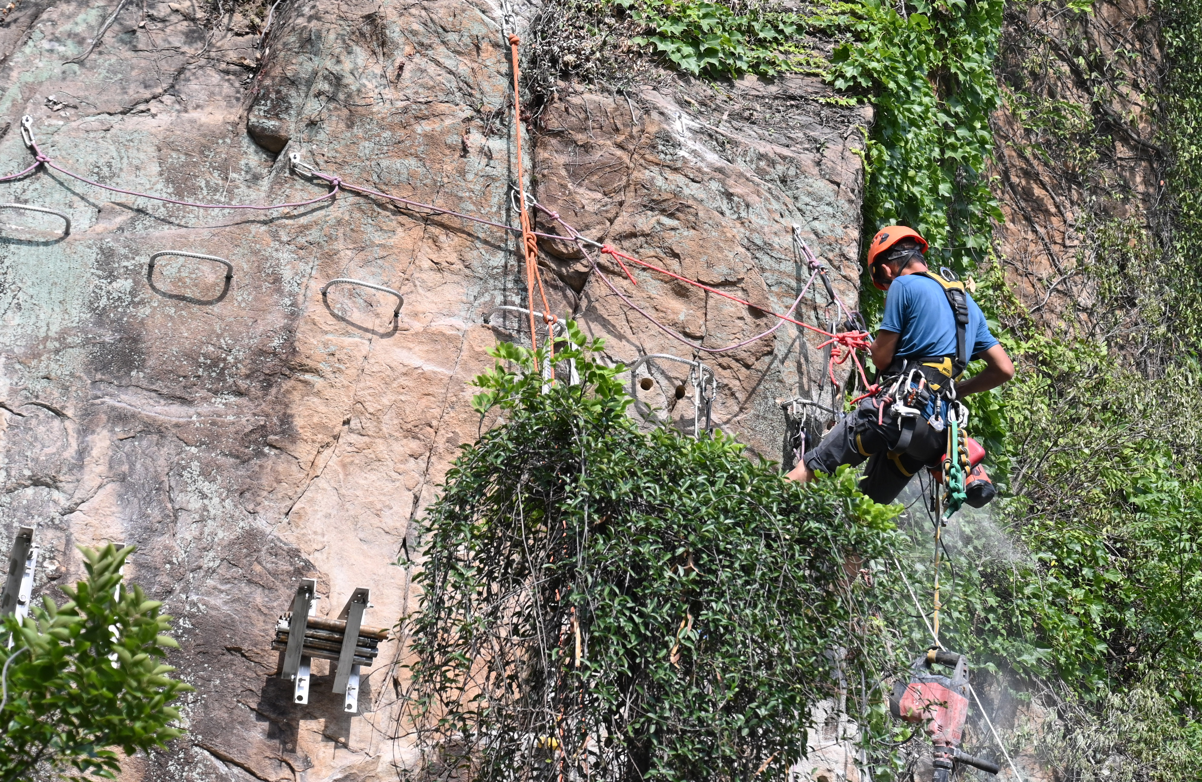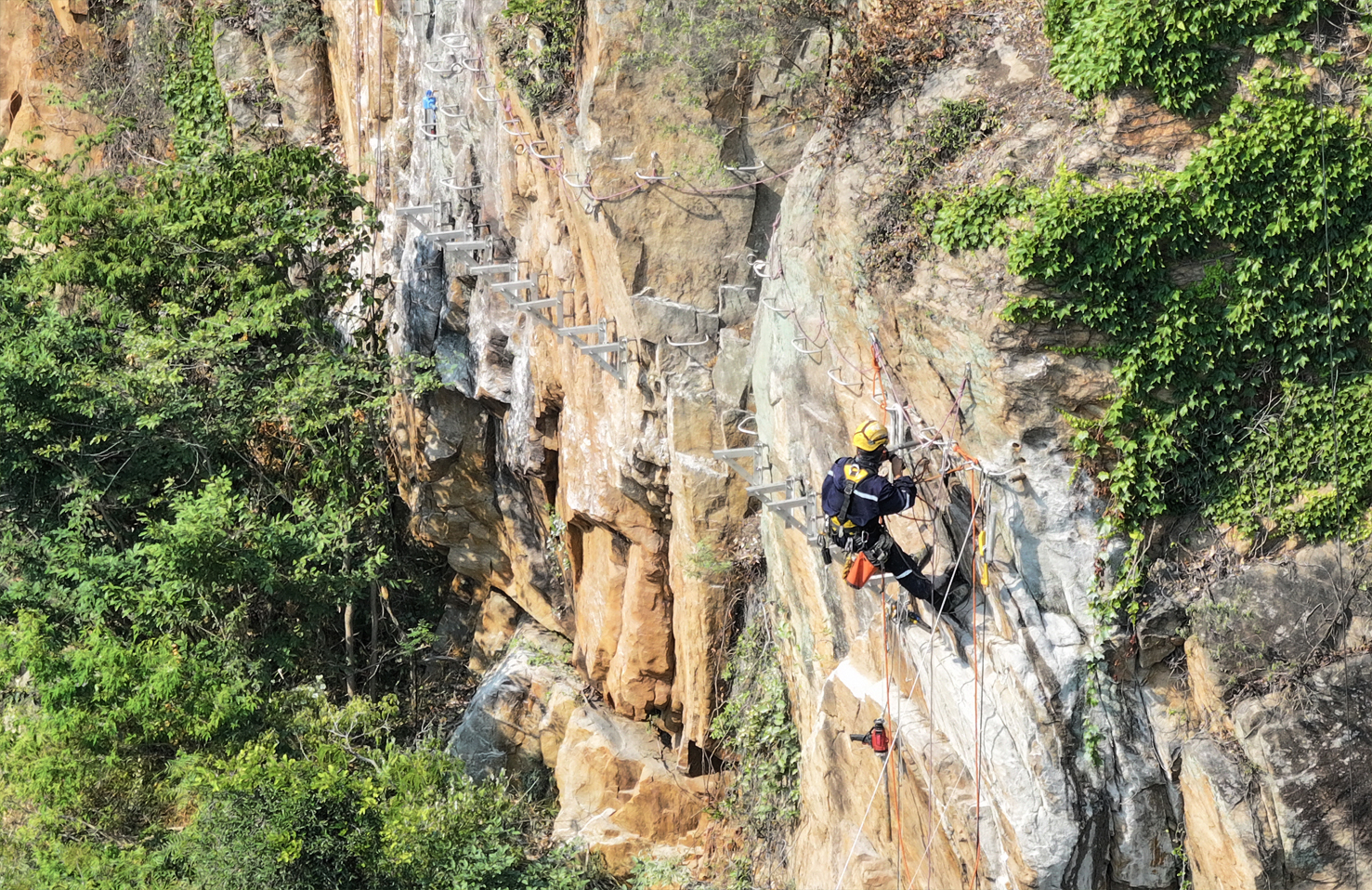 沿着渔湾景区珍珠瀑广场的山体一路向上,嶙峋的崖壁间传来阵阵电钻轰鸣。建设者们如蜘蛛人般悬在陡坡上,他们携带电钻等工具,腰间的扳手与岩壁碰撞出清脆声响,这幅“愚公移山”的画面正是渔湾景区正在建设的溯溪飞拉达,项目建成后,游客可以选择徒步游览、亲水户外体验、岩壁挑战、俯瞰渔湾全景等多种线路,带来特殊的登山体验。