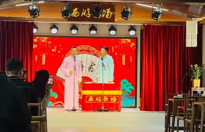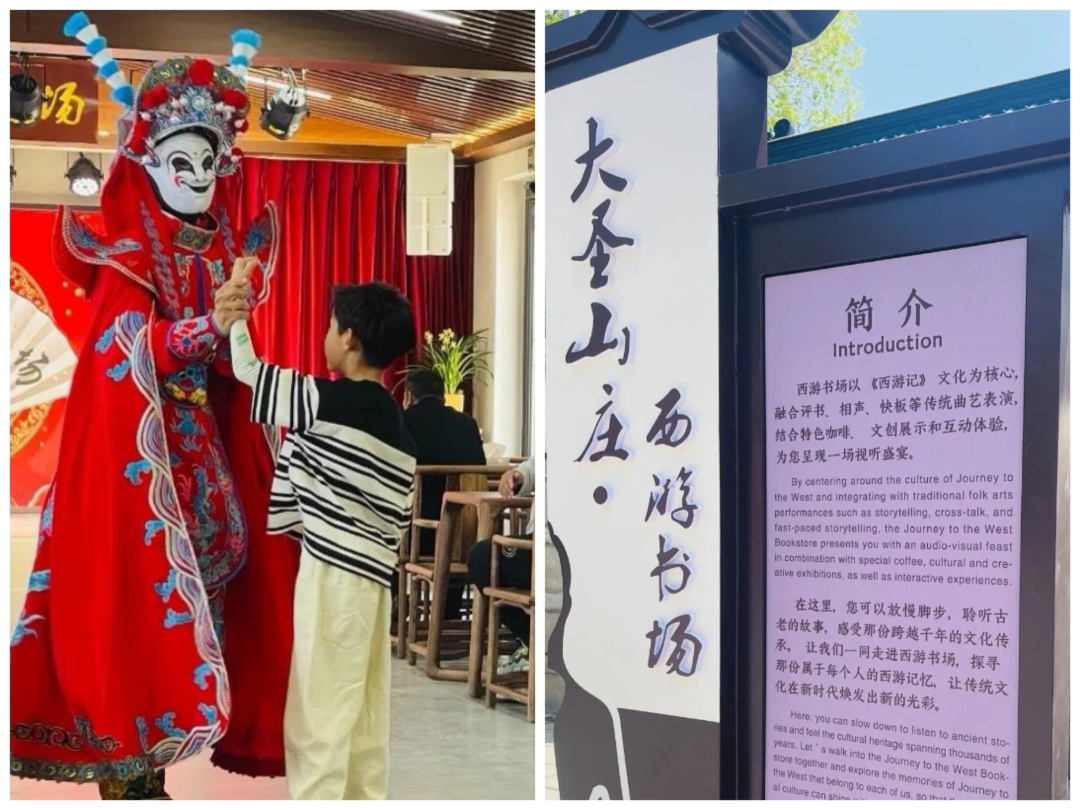 在大圣山庄,新建成的西游书场门庭若市,成为了花果山又一处网红打卡点。在这里,《猴王出世》《三打白骨精》《山中大王》等经典相声、评书、快板一一登场,广大游客一边歇脚,一边欣赏着中国传统曲艺。看罢演出,观众还可“一站式”品尝茶咖、购买西游文创产品等,享受一场“可听可看、可感可玩”的西游文化奇幻之旅。“现场听相声和电视上看到的感觉完全不一样,特别是在花果山听西游主题相关的相声,更是感觉《西游记》的故事就在我们眼前上演,表演非常精彩。”来自河北的游客张清怡说。