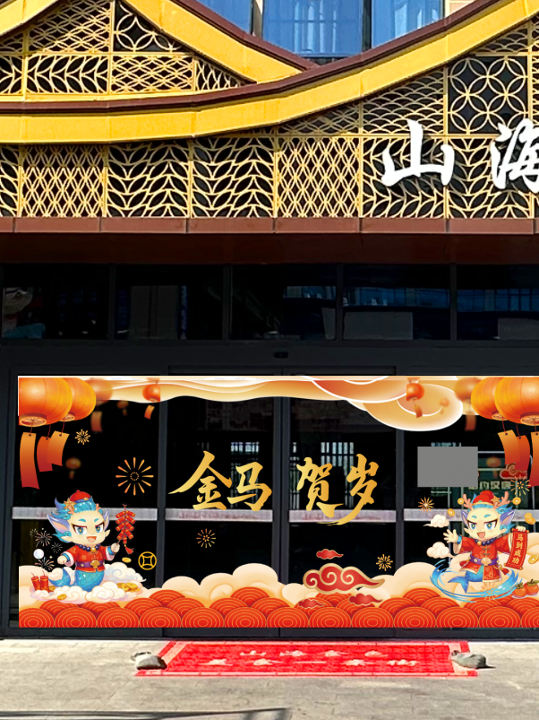 此外,欢乐城各业态的门窗,都贴上了精心设计的马年主题门贴,“金马聚福”“马跃鸿途”“马驰梦圆……