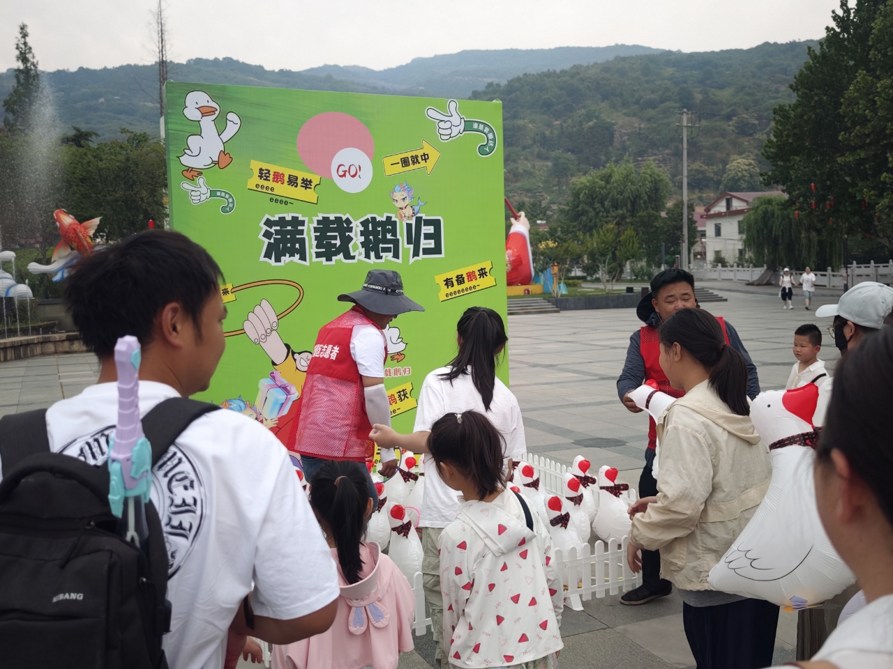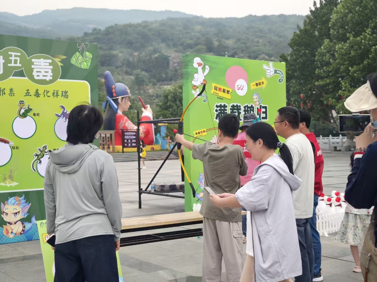 在渔湾景区,端午小长假期间同样精彩纷呈。在小游园广场、小红花营地,以“粽情端午 童趣渔湾”为主题的文化游园会吸引了许多市民游客。“射五毒”“钓粽子”“抓大鹅”等互动游戏前欢笑声不断,孩子们或拿起弓箭瞄准画有蝎子、蜈蚣等“五毒”的靶子,或用鱼竿小心翼翼地钓起迷你粽子,每个人都专心致志。小游园广场上,传统游戏区笑声不断。