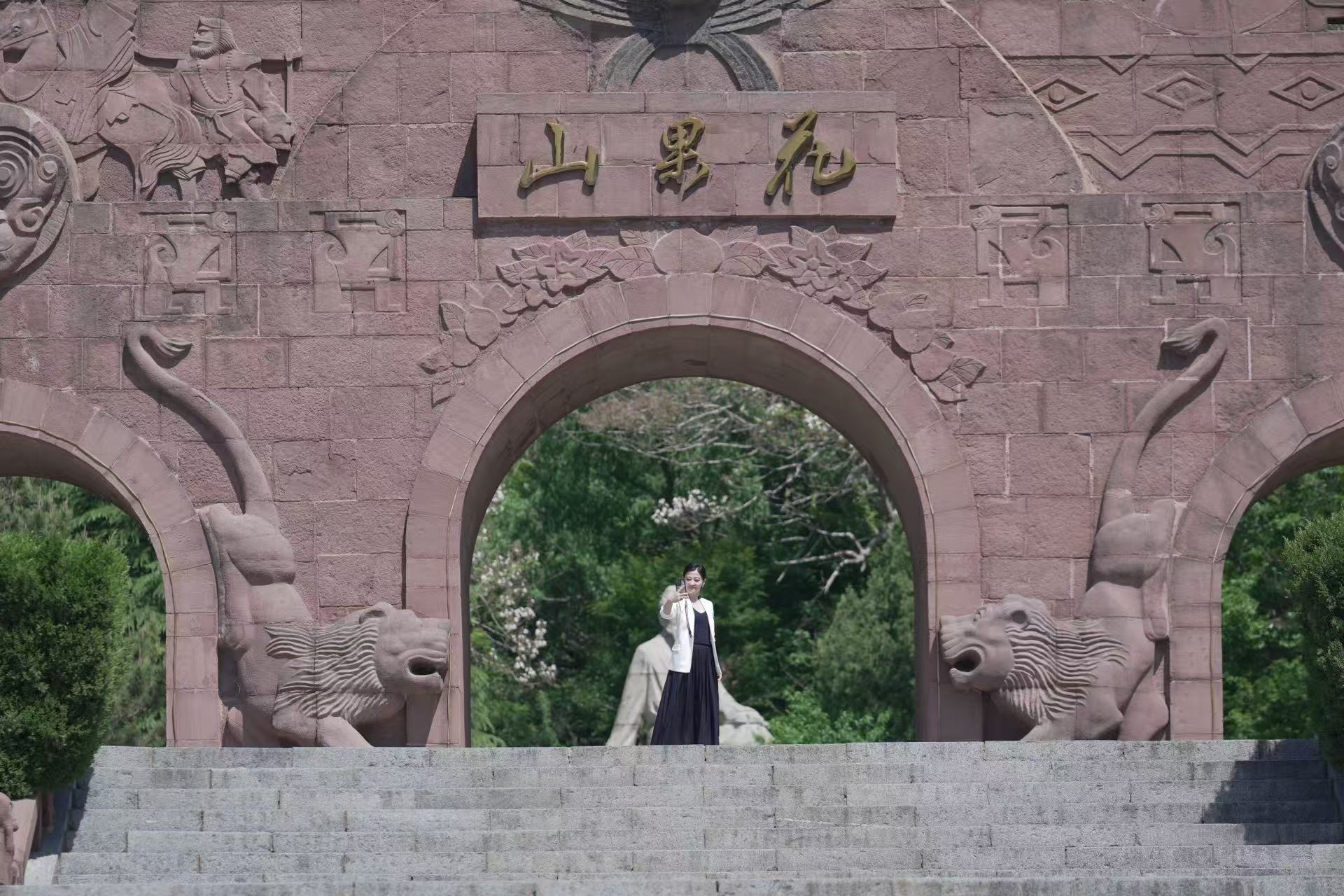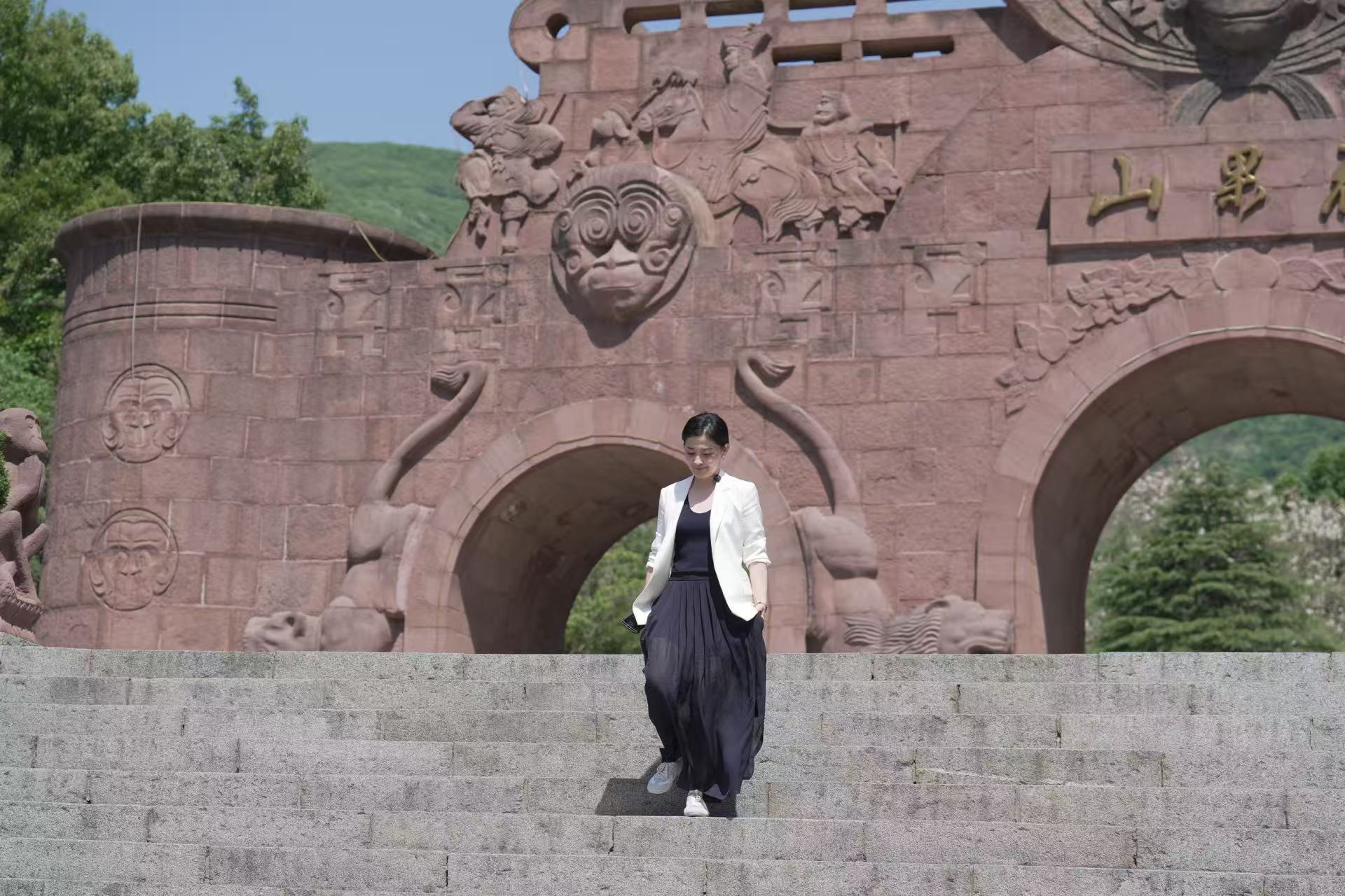 来到花果山,梅婷的第一站便选择了花果山山门,在此感受花果山浓郁的西游元素。花果山山门于1996年7月1日建成,正门上首为孙悟空头像,背衬圆形图案,北侧有唐僧师徒4人取经的浮雕,山门的门楣中央为毛泽东手书集字“花果山”三个阴刻大字,山门背面的匾额上镌刻“东胜神洲”四字,浑然天成、苍劲古朴,达到视觉美感与丰富内涵的完美和谐。
