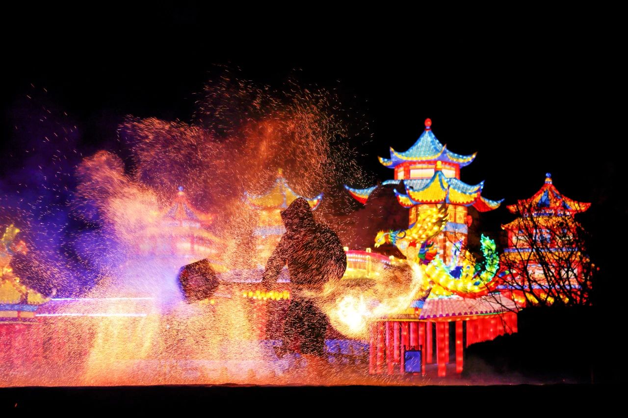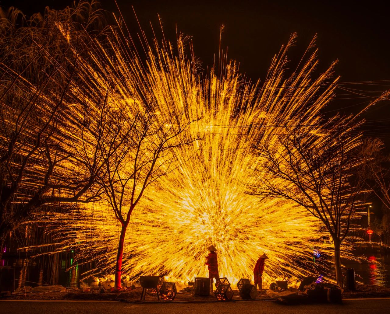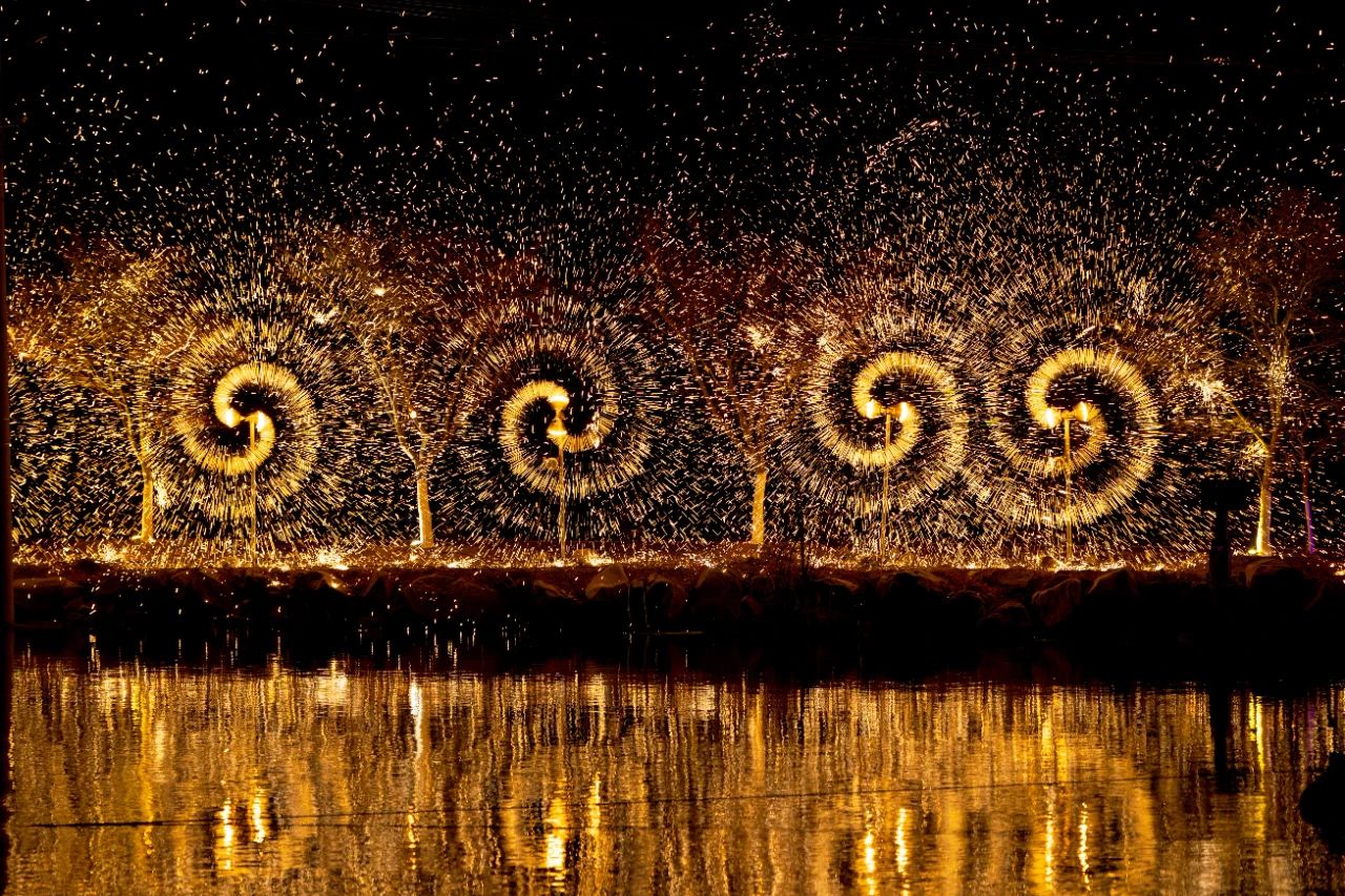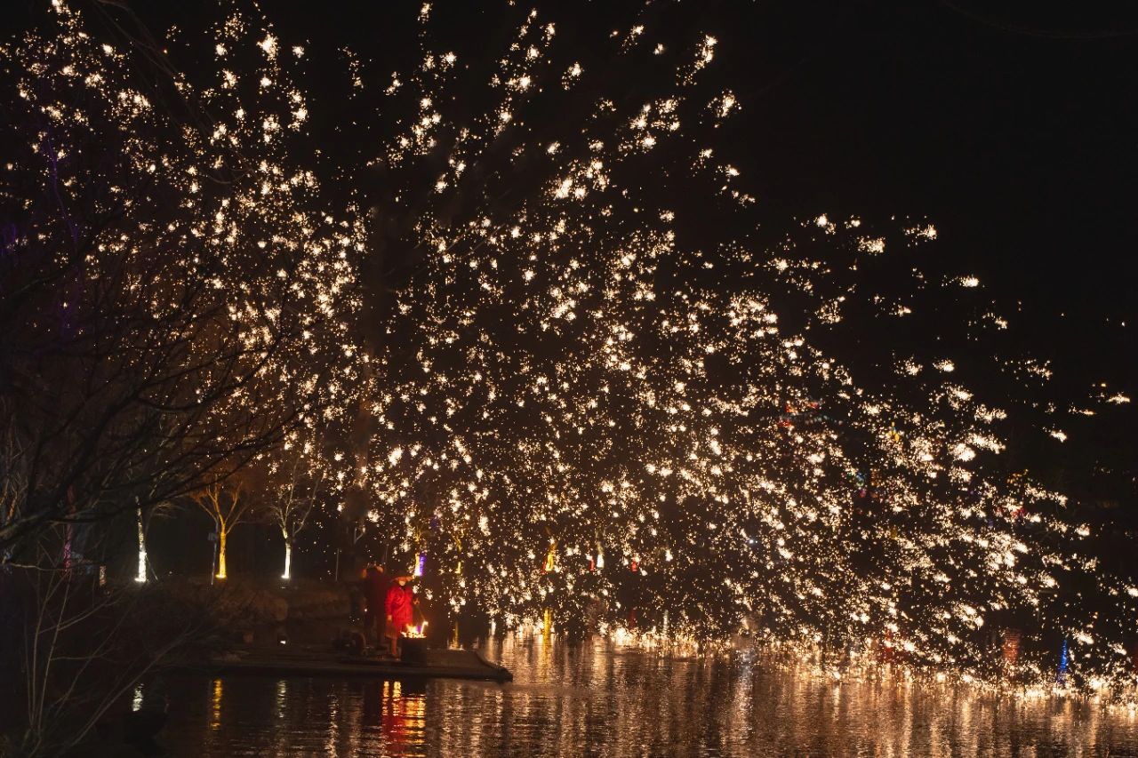 打铁花是中国古代匠师们在铸造器皿过程中发现的一种民俗文化表演技艺,至今已有千余年历史。本次灯会,景区将非遗表演打铁花融入其中,铁水化作璀璨的流星,在夜空中绽放出绚丽的花朵。此外,独具特色的传统火刀火棍、水上火壶等表演更是将现场气氛推向了高潮。