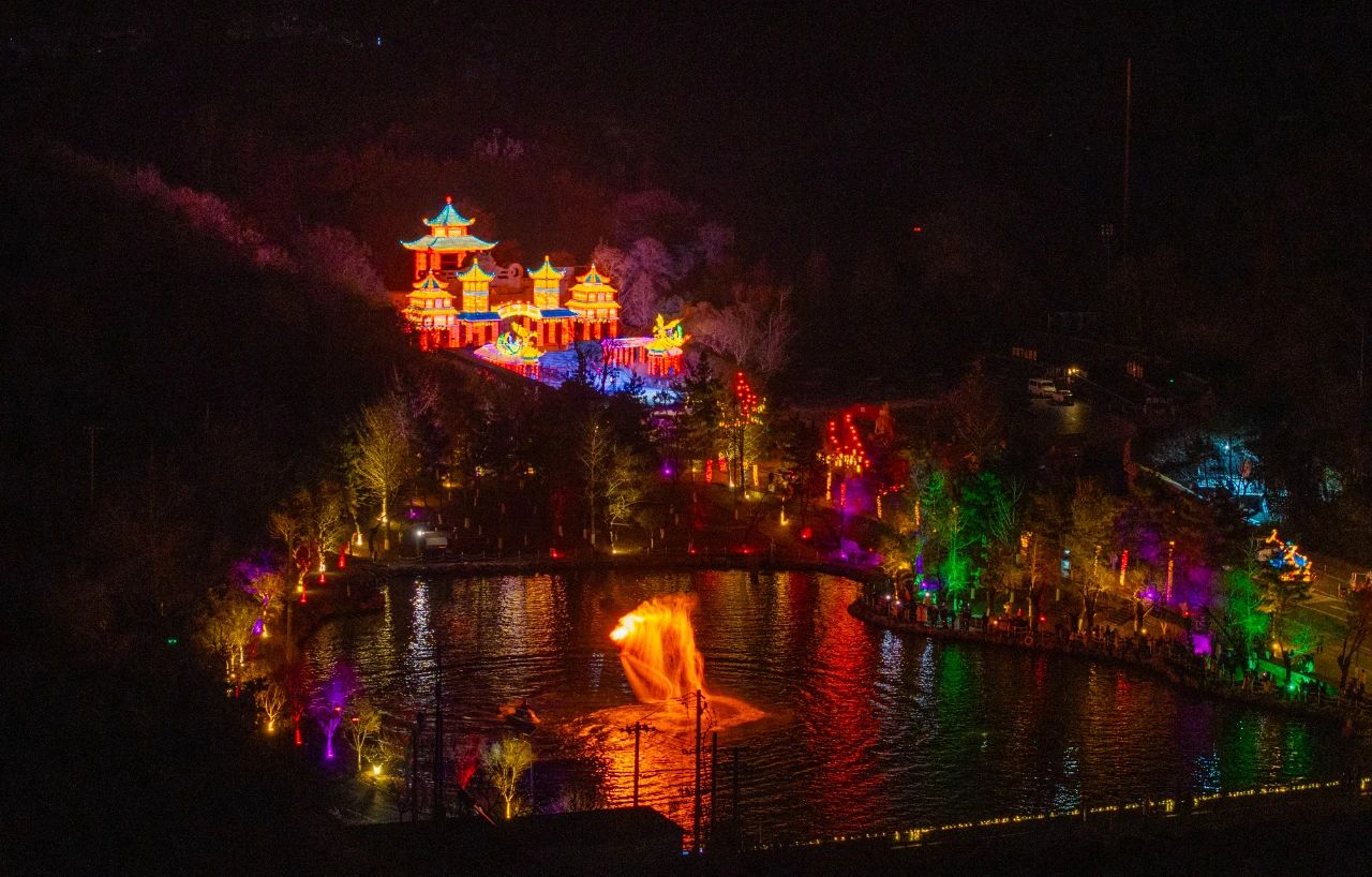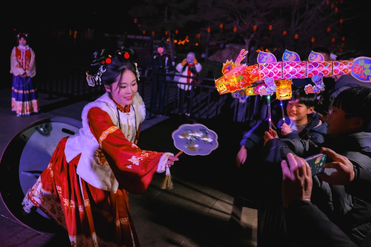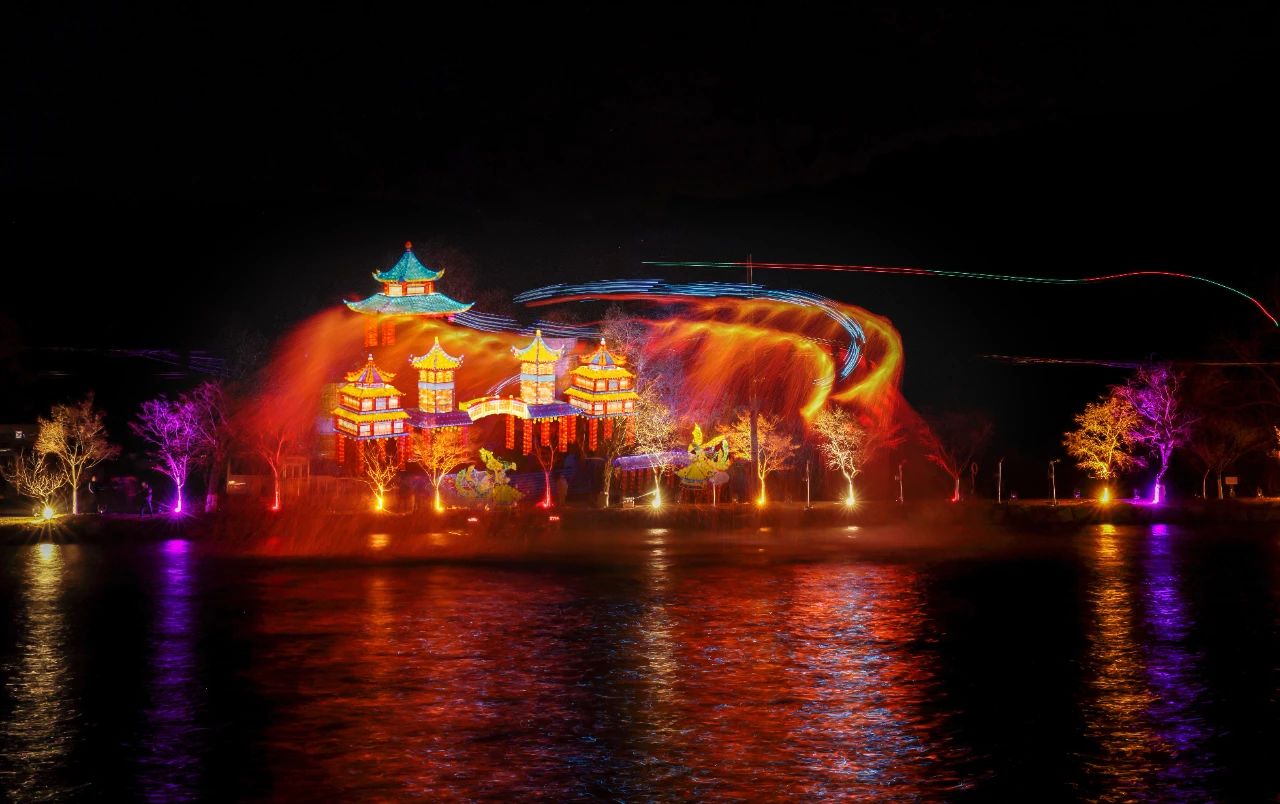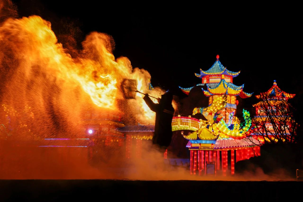 打铁花是中国古代匠师们在铸造器皿过程中发现的一种民俗文化表演技艺,至今已有千余年历史。本次灯会,景区将非遗表演打铁花融入其中,铁水化作璀璨的流星,在夜空中绽放出绚丽的花朵。此外,独具特色的传统火刀火棍、水上火壶等表演更是将现场气氛推向了高潮。