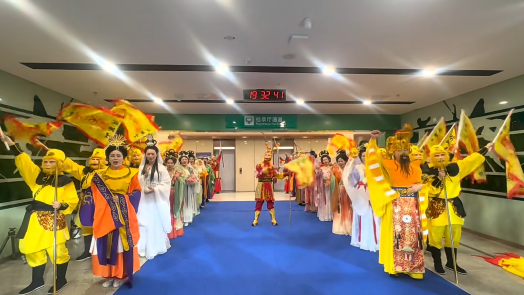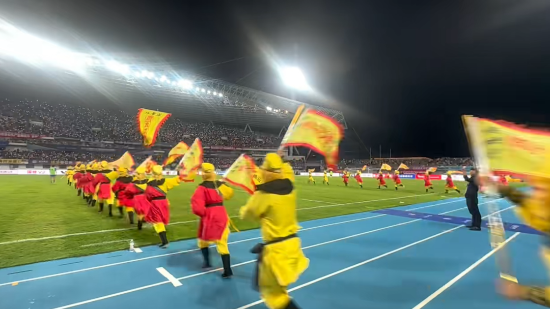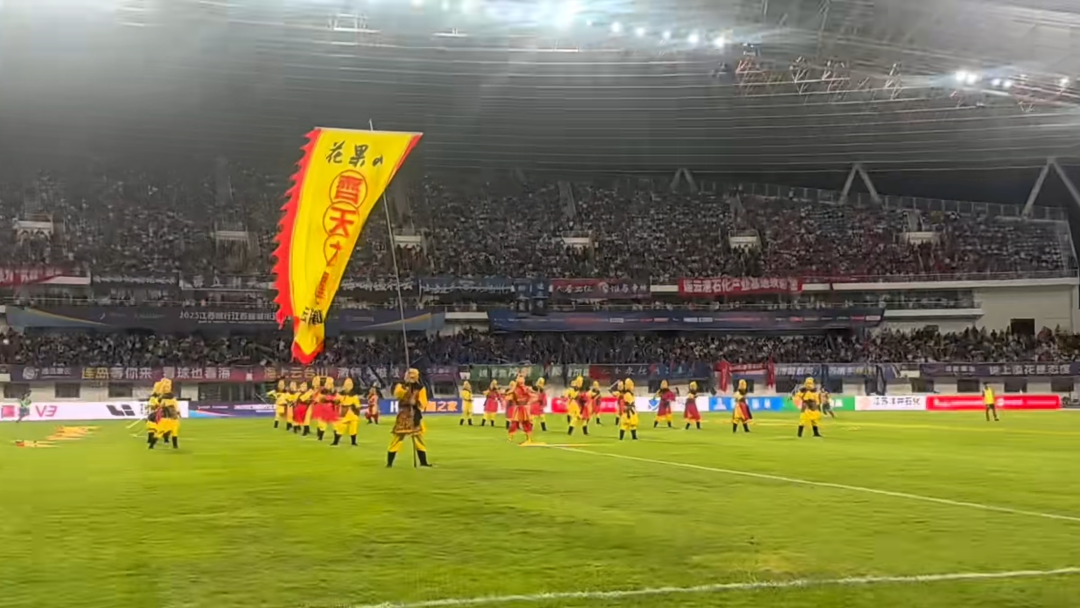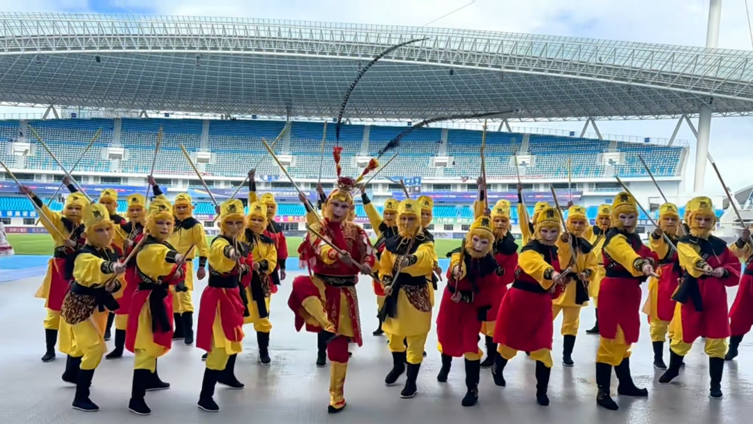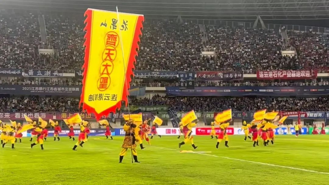 比赛中场休息时,绿茵场摇身变成“西游乐园”,花果山景区精心打造的“西游拉拉队”闪亮登场,各路神仙衣着翩翩,姿态优雅,为足球健儿加油助威。其中最亮眼的当属美猴王方阵,随着花果山旗帜的飘扬,身着“取经”经典服装的“孙悟空”和身着美猴王装扮的“齐天大圣”齐舞金箍棒,整齐威武,为现场观众带来一场极具视觉冲击力的西游主题表演,引得球迷欢呼不断。